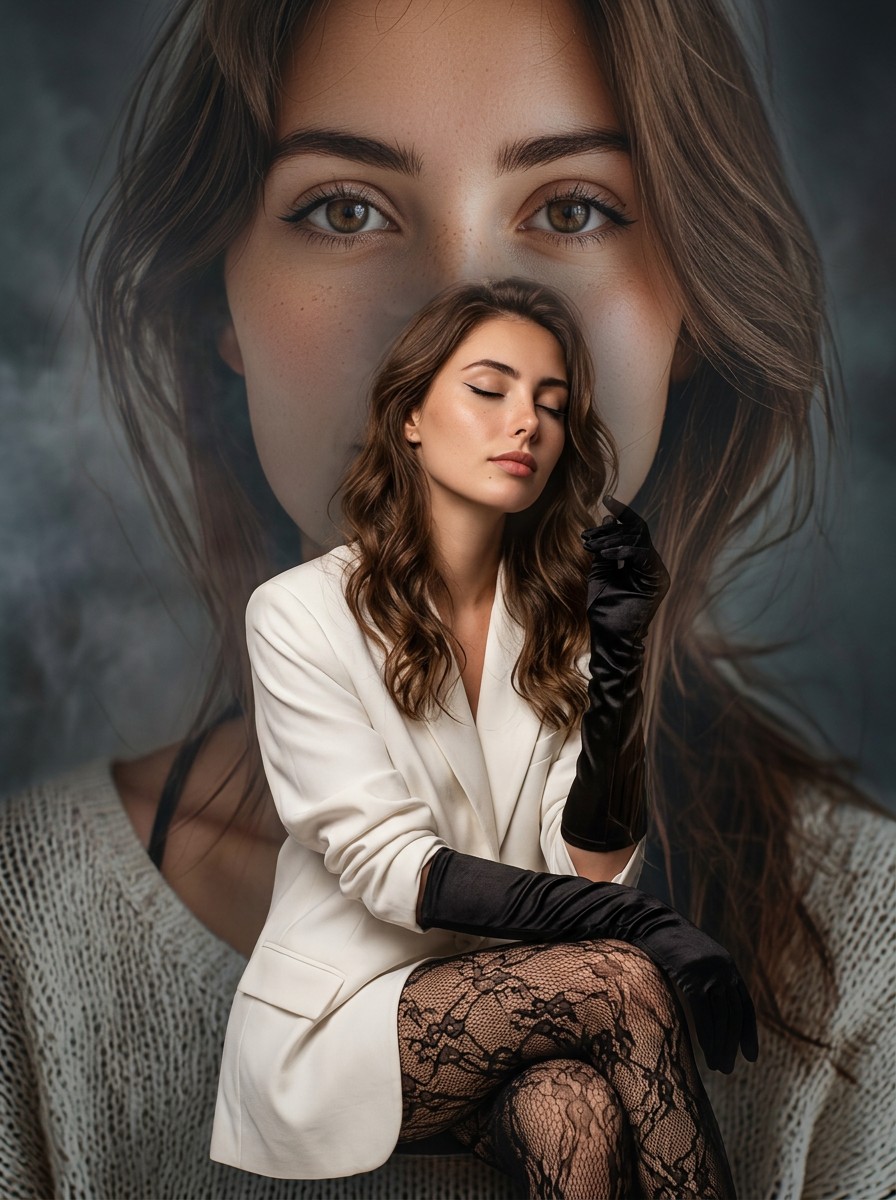 A high-resolution, photorealistic vertical studio portrait with cinematic lighting, smoky background, sensual pose and a double-exposure composition combining a close-up face and full-length figure.