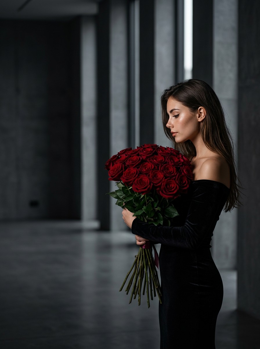 A cinematic low‑key portrait of a woman in black velvet holding deep red roses, with soft side lighting, dramatic shadows, and rich texture.