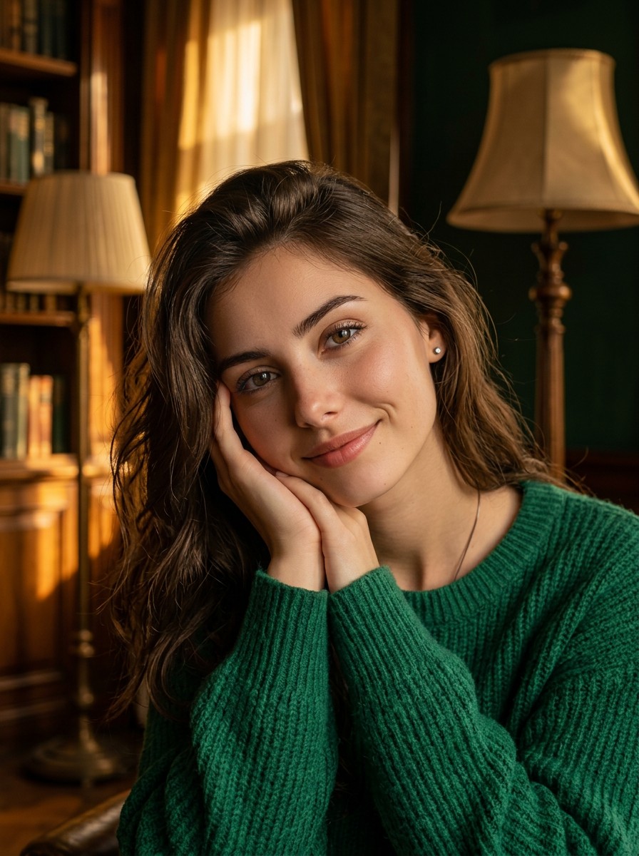 Warm golden-hour close-up portrait of a young woman in an emerald cashmere sweater with natural-glam makeup, set against a vintage library bathed in sunset highlights.