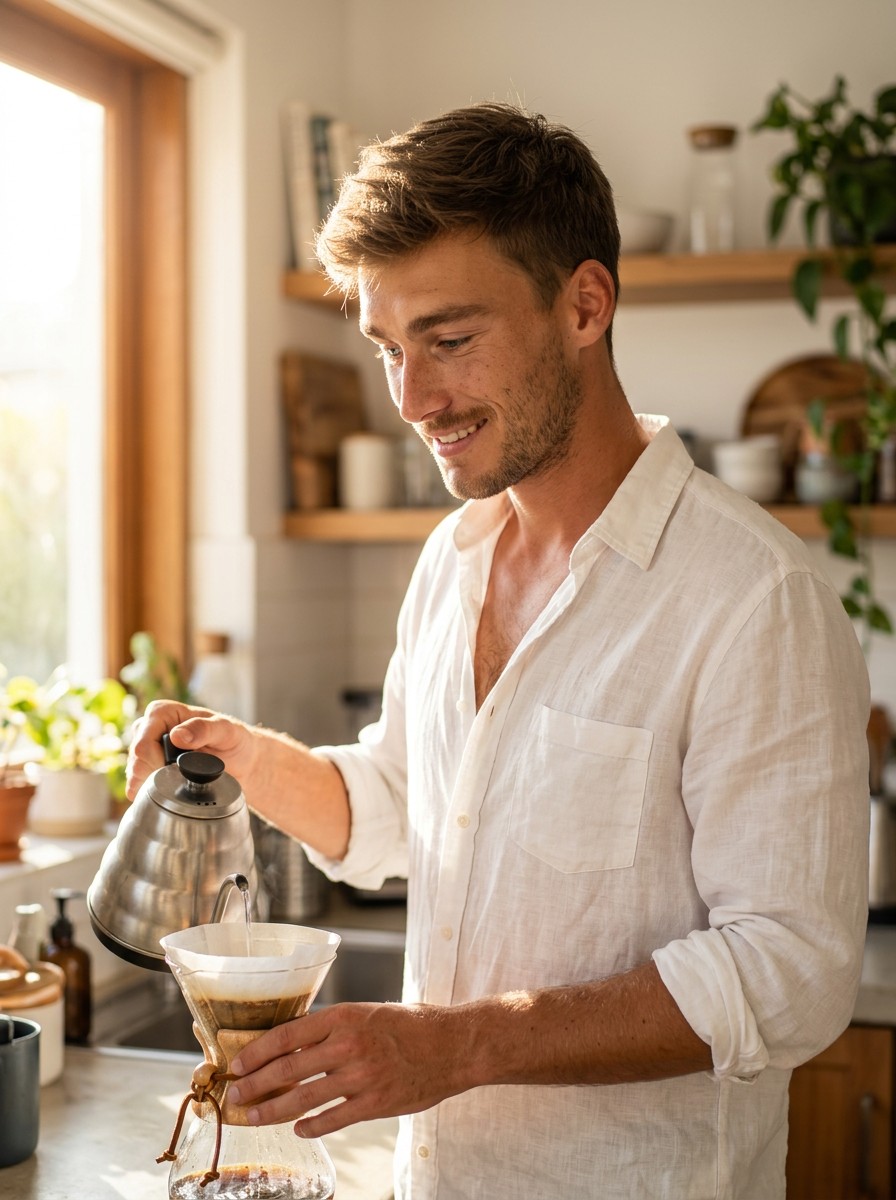 Candid morning lifestyle portrait of a man in a white shirt brewing coffee in a bright apartment, captured in warm soft side light with photorealistic detail and shallow depth of field, preserving the subject's face 1:1.