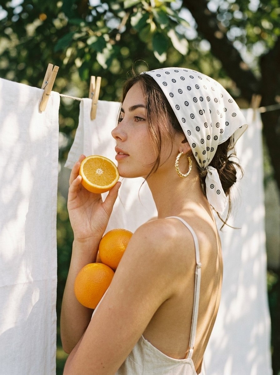Shoulder-up outdoor side-profile portrait with a white headscarf, gold hoop earrings and oranges, captured in warm vintage film tones with soft grain and dappled sunlight.