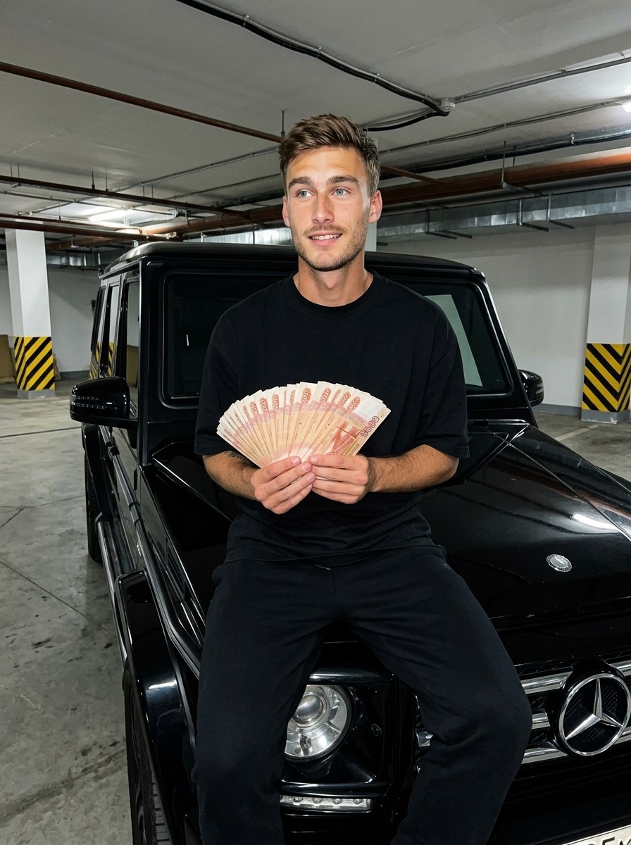 Vertical 9:16 RAW-style night portrait shot on iPhone 17 of a man on a black G‑Wagon hood in an underground parking with harsh direct flash, high contrast, crisp reflections, visible grain and a cinematic, unpolished street atmosphere.
