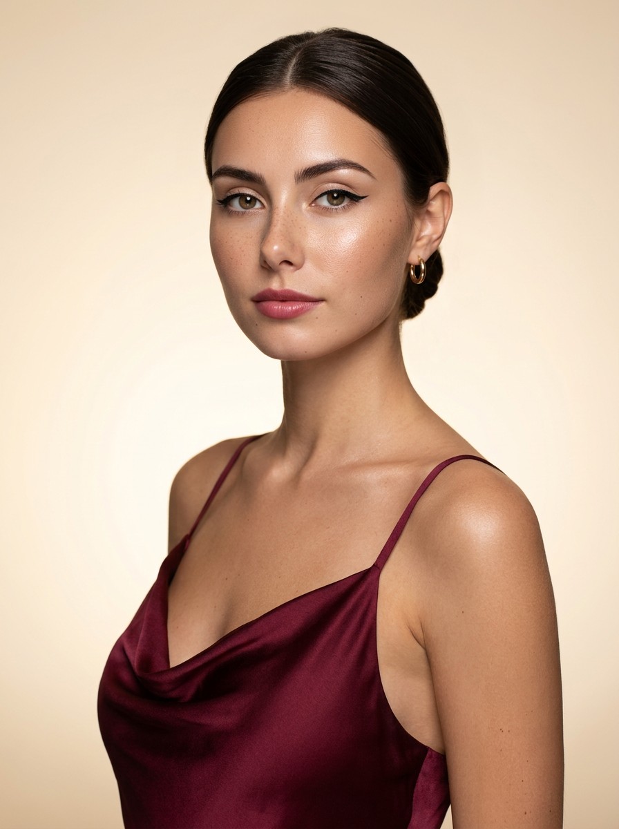 Waist-up color studio portrait of a female subject in a deep wine-red satin dress with a sleek low bun, clean makeup and warm beige gradient background, using the uploaded photo as a 1:1 face reference.