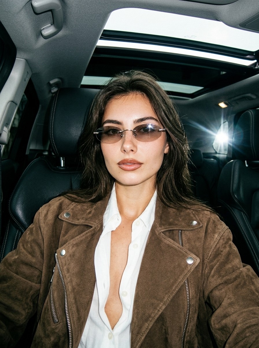 Ultra-realistic Y2K portrait selfie in a luxury car with harsh direct flash, film grain, and natural styling.