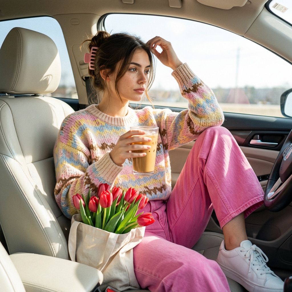 Color, postura, atmósfera y styling empujan en la misma dirección para que el look se entienda rápido.