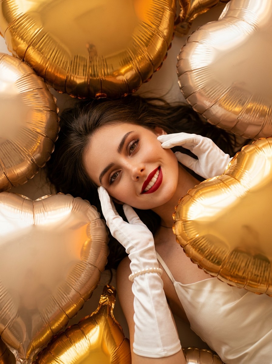 Retrato cenital en estudio de una mujer entre globos corazón de foil dorados y champán, iluminado con tonos cálidos para un aspecto romántico y lujoso.