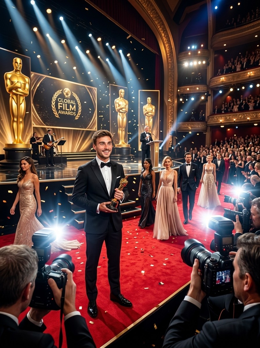 Ceremonia de premios fotorrealista en alfombra roja con estatuillas doradas, invitados glamurosos, focos dramáticos y iluminación cinematográfica.