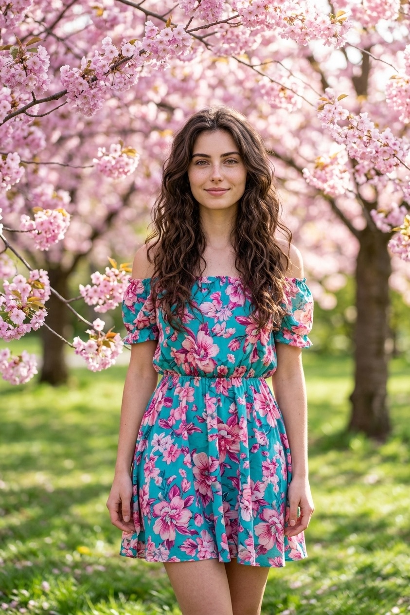 Retrato fotorrealista y atmosférico de una joven junto a un árbol de flores crema en la suave luz primaveral, con maquillaje natural, vestimenta minimalista y bokeh sutil.
