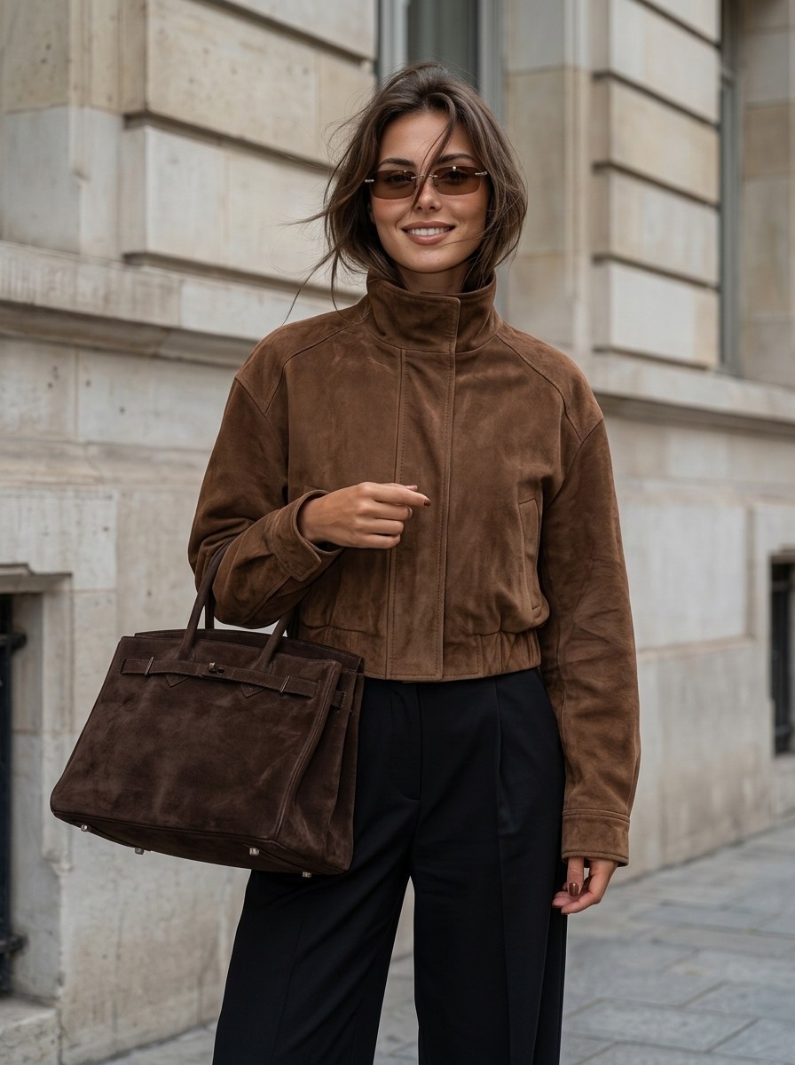 Retrato editorial de alta moda con un trench‑bomber marrón corto, pantalones negros de pierna ancha y un gran bolso de ante marrón estilo Birkin frente a una fachada de piedra europea en luz nublada con flash frontal marcado.