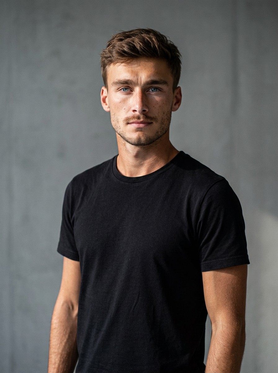 Retrato de estudio minimalista y fotorrealista de un sujeto masculino que preserva las facciones 1:1, con luz lateral dura y expresión neutral y confiada.