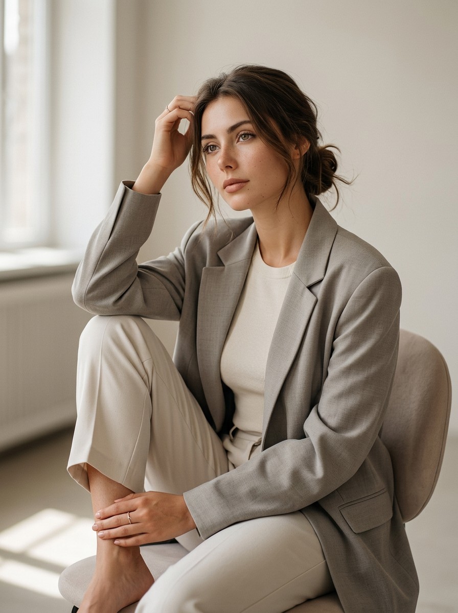 Фотореалистичный портрет женщины в минималистичном интерьере с мягким боковым светом, малой глубиной резкости и тёплой нейтральной палитрой.