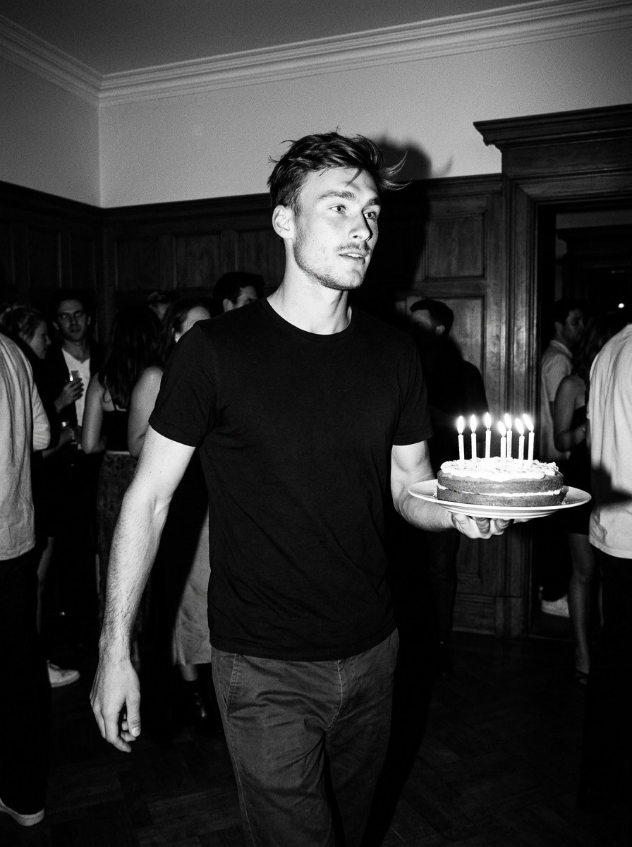 Фотореалистичный черно-белый портрет с фронтальным флешем: субъект в движении держит торт с зажжёнными свечами, высокий контраст, кинематографичная атмосфера 90-х и лёгкое размытие движения.