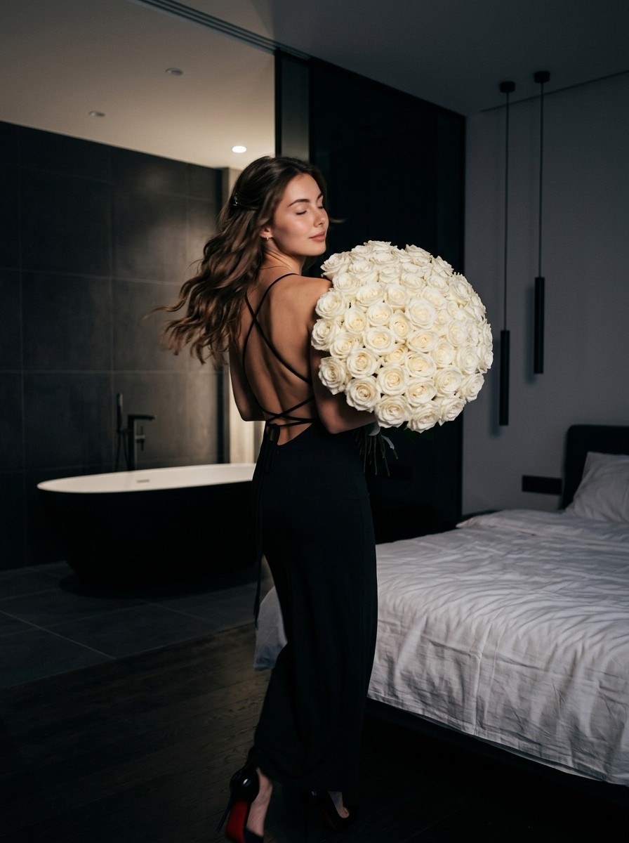 Интимный low-key кинематографичный портрет женщины с сияющим букетом белых роз, глубоким монохромным интерьером и лёгкой пленочной зернистостью.